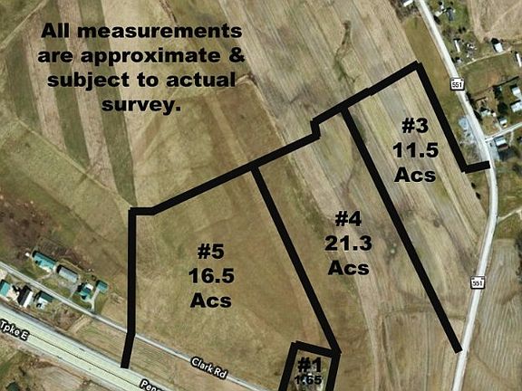 To settle the estate, all sells on location: MONDAY – MAY 19, 2014 – 6:00 PM Auction #1 – Mary Jane Clark Estate 64+ Acre Farm Land Plus Century 2 Story Home Offered in Parcels and As Unit TERMS ON REAL ESTATE: 10% down auction day, balance due at closing. Buyer's premium of 10% to be added to the final bid to establish the purchase price. Any desired inspections must be made prior to bidding. All information contained herein was derived from sources believed to be correct.
