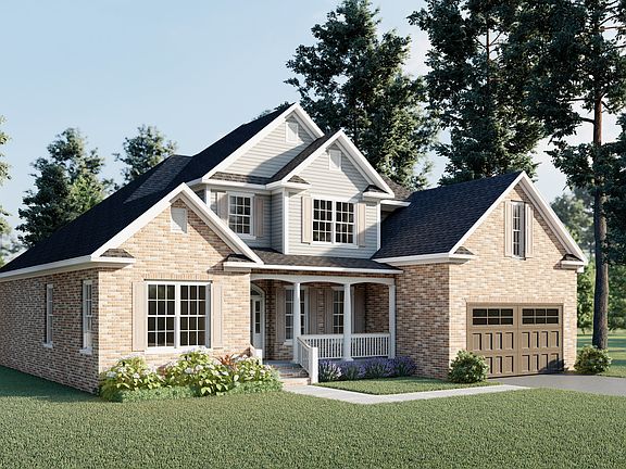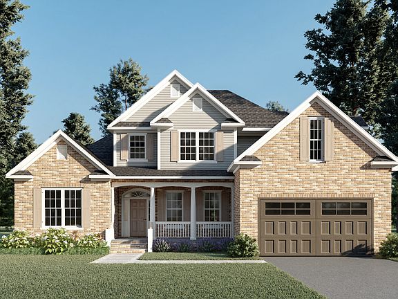 Two story brick home with front-facing two-car garage, a covered front porch and partially covered back porch. Semi-open living on the first level with the kitchen, family room and dining room all being central to the floor plan. Master bedroom features walk-in closets and a private bathroom. Additional bedroom on the first floor sits adjacent to the laundry and garage entrance. Upstairs are three bedrooms, two bathrooms and a large bonus room. Total of 3200 square feet in this King plan built by Blythe Building Company. Renderings produced are meant for illustrative purposes only. Finishes seen in renderings are not guaranteed and subject to change upon completion of the home. Buyer to confirm finishes prior to contract.