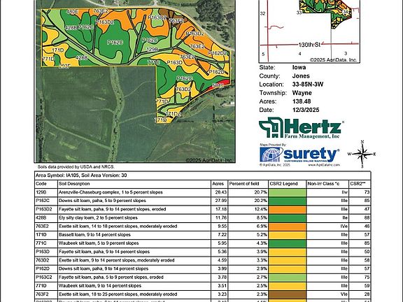 This is a nice Jones County farm located along a hard-surfaced road. Primary soils are Arenzville-Chaseburg, Downs and Fayette. CSR2 on the 138.48 crop acres is 66.70. See soil map for detail. There are 10.78 acres enrolled in a CP-8A contract that pays $3,234.00 annually and expires September 30, 2031.
