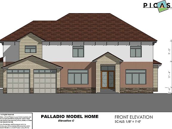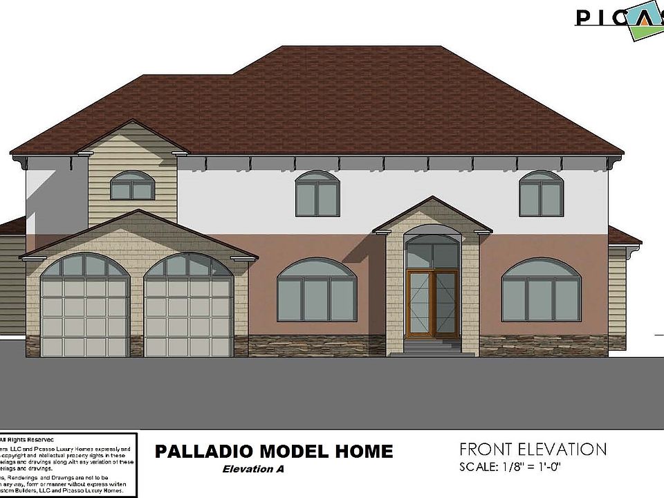 The Palladio 5,250 sq ft Model Home with a 550 sq ft 2-car attached garage was inspired to provide a simplified design with the uniqueness that Picasso Homes provides its Clients'. Working on the premise of Buyers having smaller lots to build on or tearing down an existing home to make way for a new Home, we combined a straight forward design that can function with your lot's restrictions while having loads of flexibility to organically fit on your lot. Inspired and designed by our own Managing Principal, its use of either Brick, Stone, Stucco and/or Siding with contrasting Accents and water table feature, this Traditional Styled design has multiple elevations and can be modified to meet your desired goals and Budget. This Four or Five Bedroom model home provides many exciting features such as a two-story Foyer, an inviting Open Floor Plan, Large Kitchen with Island, Large Mudroom and Pantry, optional elevator, unique Office/Library/Flex Bedroom on Main Level, Expanded Parent's Suite with loads of closet space, Open Upper Floor Hallway, all bedrooms have their own full bathroom, Laundry on Upper Level and so much more. There are many upgrades and options available to suit your specific needs and styles to make this Home your very own! The 1,880 sq ft Lower level can be finished to suit your needs and budget. Please NOTE that the Prices shown are for the HOME DESIGN/BUILD PRICE ONLY and the lot/land are purchased or provided separately.