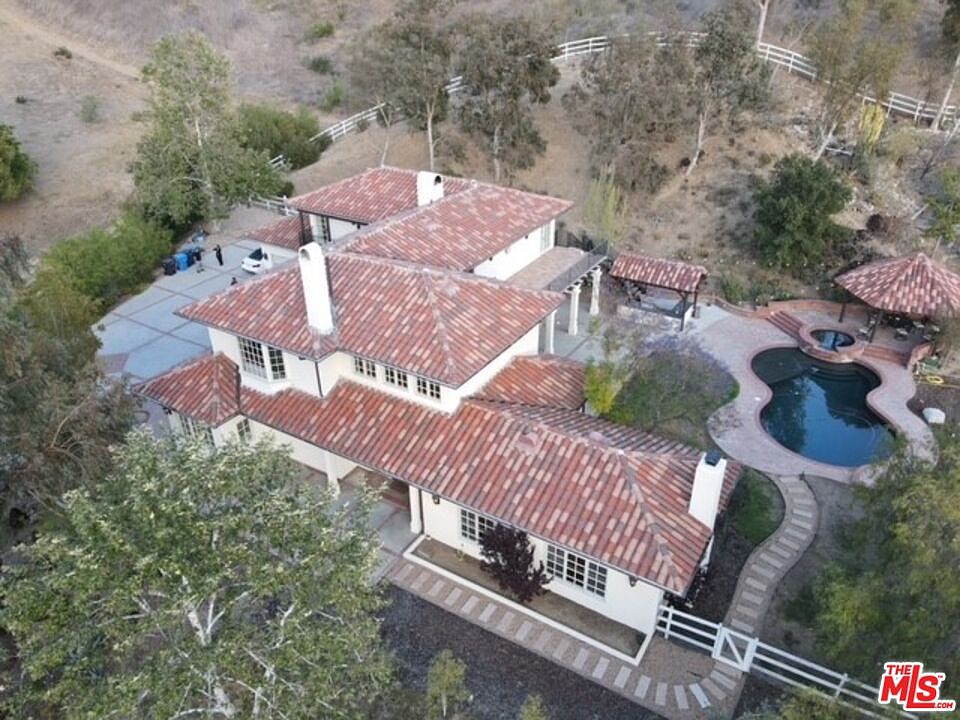 "ONE OF A KIND" High on a Knoll with panoramic views sits a rare 2 acre+ home at the end of a long private driveway. This Spanish Mediterranean estate is a MUST see, features include an elegant living room, hand carved wood beams with corbels accenting the vaulted ceilings and fireplace. Large formal dining room seats 12. This is completely custom throughout. Family room has a wet bar with Scotsman ice maker with wood beams and another fireplace. The gourmet kitchen is done in Sea Pearl marble, large breakfast room, walk in pantry, all stainless Viking appliances 6 burner oven with gridle, refrigerator, dishwasher and microwave. The Master bedroom includes a sitting area with fireplace, and a romantic balcony. The luxurious master bathroom is Travertine with a copper tub, his and hers copper sinks, built in make-up counter, The enclosed steam shower is his and hers with duel showers and a large bench. More highlights of this home include a temperature wine room, 3 wood fireplaces, smart house system, and Acacia engineered wood flooring throughout most of the home. All closets have built-ins. Large flat pad above the home for horses or play. 3 separate entry garages with enough parking for 12 cars and a mobile home. Pebble Tek saltwater pool with spa and gazebo. 30' sole gourmet BBQ, side grill, Viking refrigerator, sink and more. Large grassy area and a side yard for children with synthetic about 1,000 square feet of synthetic grass. Bell Canyon is one of the most sought after guard gated communities with an Equestrian center with riding, club house, gym, tennis courts and numerous annual events for all ages. The Las Virgenes schools are award winning and some of the best.