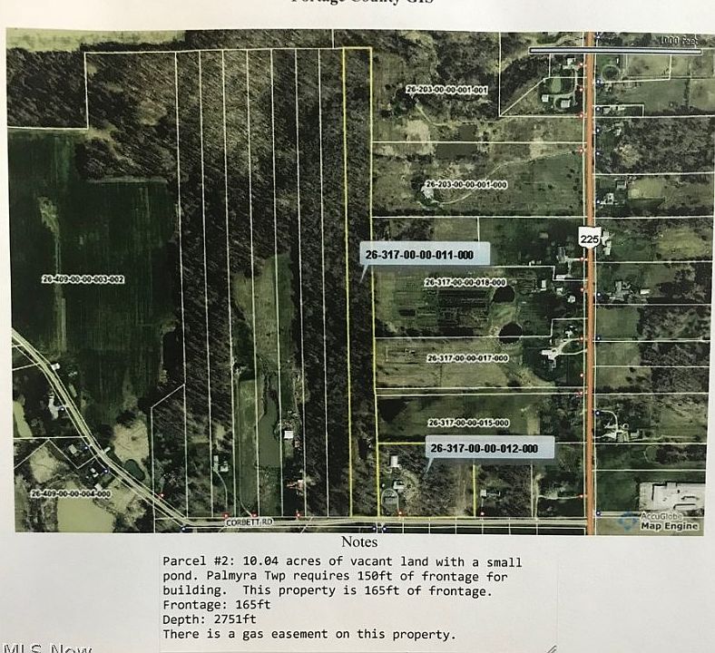 Parcel #2: 10.04 acres of vacant land with a small pond. Palmyra Twp requires 150ft of frontage for building. This property is 165ft of frontage. Frontage: 165 ft Depth: 2751 ft There is a gas easement on this property. No free gas on this parcel. Parcel #1 - 6 acres with a brick home two large outbuildings and complete with free gas! Frontage: 576 ft Depth: 447 ft Two bedroom home with one bathroom - upstairs has two bedrooms and a possible bathroom - upstairs is not completely finished. Outbuildings are 24'x60' & 40' 100'.