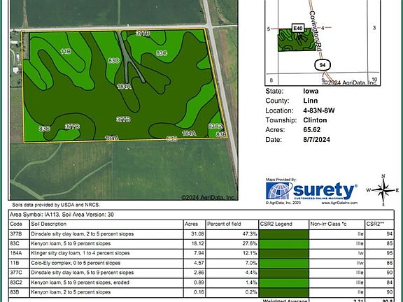 This is an excellent Linn County farm with a 90.80 CSR2, located just northwest of Cedar Rapids on a hard-surfaced road. Seller has two additional tracts of land for sale located west of this property. See Additional Land Aerial Photo.