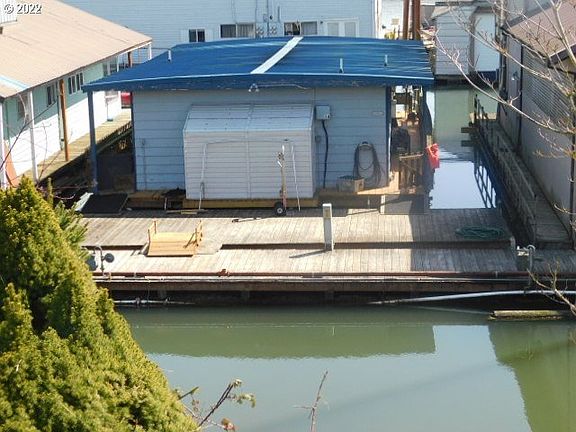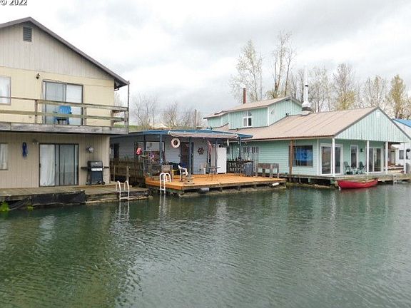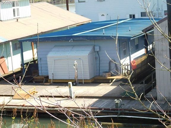 You can keep a small boat out front. Enjoy life on the water, relaxing on your deck. Great condo alternative. This floating home was updated in 2013-14 with metal roof, and updated windows, and just recently new carpet. All appliances stay, including washer and dryer. The deck has powered awning and back deck for entertaining on the river or just wanting to hang out and enjoy the elements of nature, and fishing, kayaking and boating.
