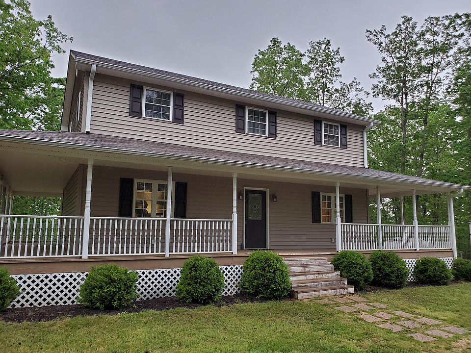 Well maintained PRIVATE 2 story home with 8.89 acres(part wooded-part open) located within 35 minutes of Roanoke.house features dual zone heat pump&gas furnace,wrap covered porch on all 4 sides!/exterior is maintenance free vinyl.Interior is finished on all 3 levels!/entry level living rm with gas log fp/lrg kitchen with dining area&all updated stainless appliances which pass with house/1/2 bath on entry level/laundry on entry&includes front load washer&dryer/upstairs has lrg master bdrm with full bath&walkin closet&2 additional bdrms&hall bath/lower level features full walkout bsmt with lrg family rm/den &office/area fenced for horse/storage building