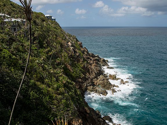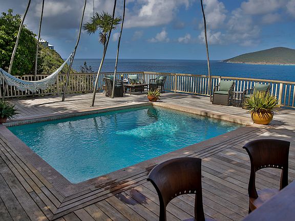 Waterfront Drama Live on the Ocean, Play the Course. Located in the gated residential and golf community of Mahogany Run, this waterfront home offers 3 bedrooms, 3 ½ baths on two levels, each level with wrap around deck and a view from every room. The 180 degree vista, including all the cays and islands along St Thomas north shore to the BVI and the sound of the ocean below capture the dramatic beauty of living on the ocean. A spacious great room opens to a large pool deck area expanding your entertaining and living area exponentially. A well- priced opportunity to buy a waterfront home in a premier neighborhood
