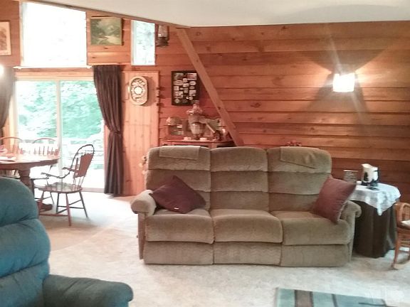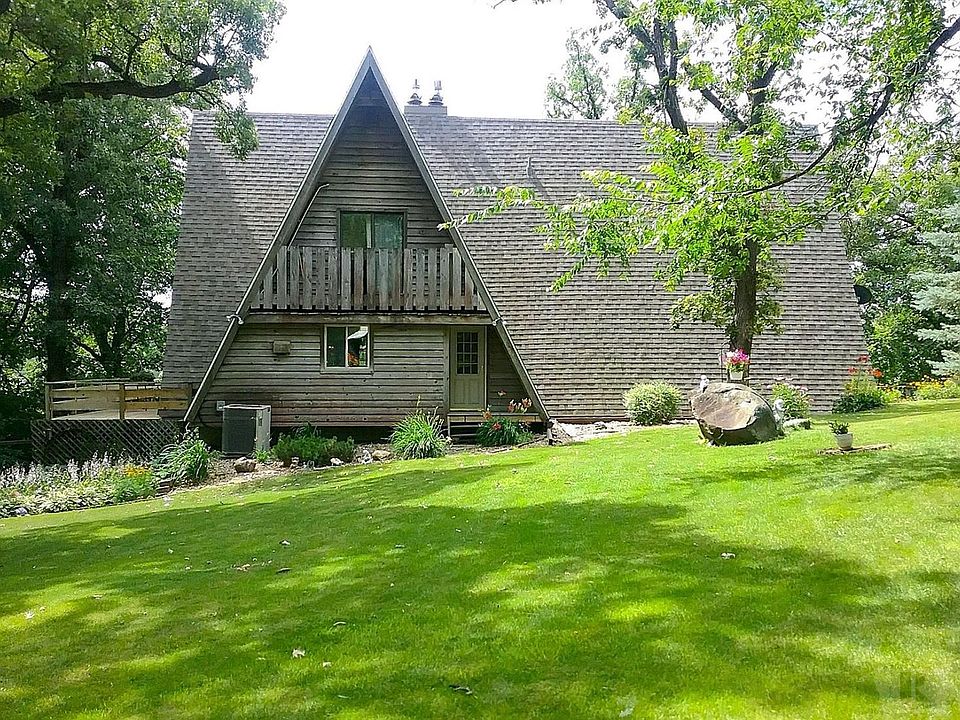A picturesque setting for this sharp A frame home. Wooded area between Marshalltown and LeGrand, Open floor plan on main level, features large windows,stone gas fireplace, 2 sets of sliders to a beautiful deck, applianced kitchen with plenty of cupboards. Upper level has 3 bedrooms, full bath, big closets and lots of extra storage. Each BR has a balcony to look out on this 1.42 acreage. Lot has wooded area plus nice flat grassy area. There many beautiful flower/perennial gardens. Lower level host a large Family room, 3/4 bath, storage room which just an egress window could make a 4th bedroom, laundry, water softener, furnace and water heater room, walk out to large patio. Over sized double garage. Call today to make this beautiful place yours!