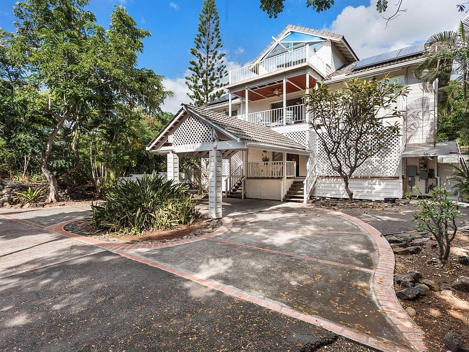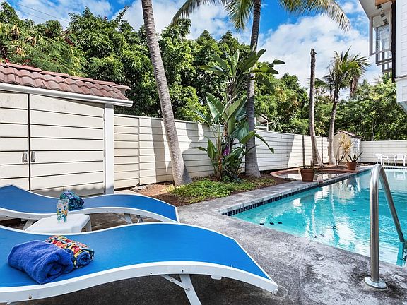 This unique, well built 3-story home was built by an architect for his own family's personal use and enjoyment and is just a short walk to the ocean from Stardust Lane! A lap pool is in the back yard and there is also a pond feature. The back property line is beyond the fence, as noted by the current survey pins. The home has a concrete tile roof with Solar City's photo-voltaic solar panels, for reduced electric costs, as well as 2-owned solar water heater panels. Downstairs are 2 separate bedroom suites (North and South), each with their own entrance, bathroom, wetbar and access to the pool. It's great for your visiting guests! There is also a full laundry room on this level as well as a 1/4 bath, for convenience when playing in the pool, and additional storage under the stairs. The main living area is on the 2nd floor with it's tall vaulted ceilings, big windows, lanais, kitchen, dining and master bedroom suite. Very comfortable and spacious. Then up once more to the third level where you'll find a well lit bonus/hobby room, complete with a fabulous mountain view, a tiled patio deck and peak-a-boo view of the ocean. It is a nice spot to sunbathe or enjoy the evening sunsets! Additional photos are available using this link: https://tours.photokona.com/public/vtour/display/917871?idx=1 . This home has a lot to offer, but could use some TLC and cosmetic upgrades, so it is priced accordingly, so please attach the AS IS Addendum. Home was tent fumigated 4/9/2018. Warranty is transferable.