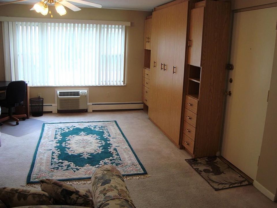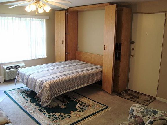 This 2nd floor studio unit, overlooking the pool, is ideal if you want to join the "tiny living" movement. The large Living Room/Bedroom has a built in queen sized Murphy Bed and storage unit. The Kitchen offers updated white cabinets, a custom built 2-tier island with additional cabinets for storage and seating for two, as well as a brand new refrigerator. Heat and hot water is included in the rent. A shared laundry room and extra storage is located on the 1st floor of the building. Unit is available from 3/1. 12 months