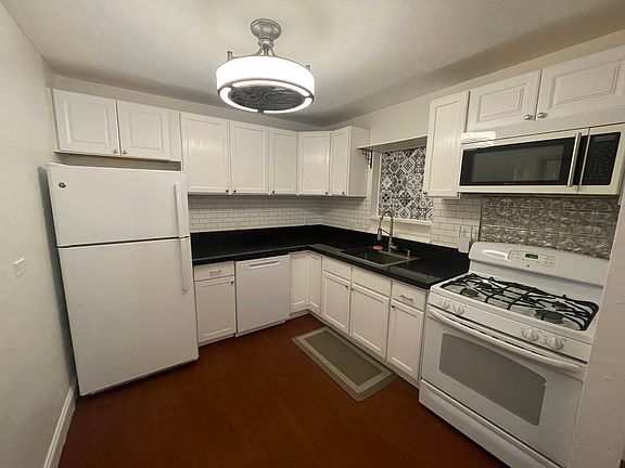 The kitchen, adjacent to the dining area, has all white appliances, cabinet storage, and a practical layout that makes meal preparation a breeze.