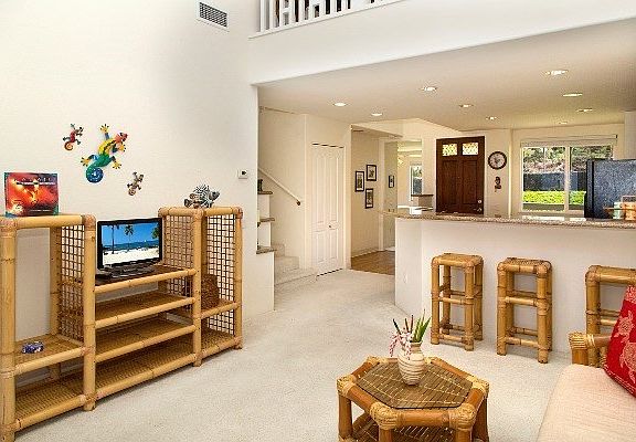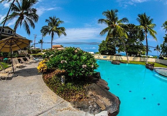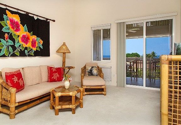 Must see! You will love the ocean views from the lanai and from the master bedroom of this top floor condo. As you sip drinks on the lanai table you can see the waves, (and hear them) at Honl's Beach. DD-23 includes a single car garage (as well as a second space next to it.) Condo's with garages are rarely listed at Alii Cove..(only a few select units include a garage,) so if you are looking for a Alii Cove condo with a ocean view location, grab this one, and have a secure place to park your car or use as extra storage. The tropical furnishings and art are all included in the sale along with kitchenware and linens. 2 bedrooms, 2 full baths plus spacious loft that can be used as an office or third bedroom. The Seller just purchased a brand new refrigerator. The monthly maintenance fee for this condo is only $ 455.63 This condo features central air conditioning when you need it. However, the DD Building is elevated high above the building below so cool ocean breezes run through the condo when you leave the windows open. The large resort style pool is solar heated and is saline. (no clorine) Convenient fitness room and fun BBQ party area on site near the pool. Close walking distance to Kona town with all the fun activities, boutique shopping, and ocean sports.