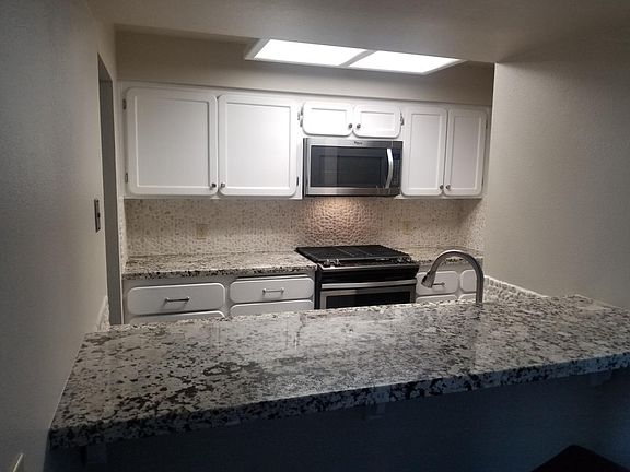 Remodeled gem, back of the complex, end unit with extra windows and privacy, parking underground a walk to your door. In the last 3 years, custom paint, Plantation Shutters Throughout, New kitchen, Granite, Flooring, Appliances, Refrigerator included, Breakfast bar, Stainless Sink, LED lighting, new doors, new Forced Air Heating system, newer water heater, Tub refinish, Rock and Tile Fireplace, 2 Skylights, Indoor utility (washer/Dryer may be included) and an Excellent Large Private balcony in the rear with storage closet and patio attic storage as well.