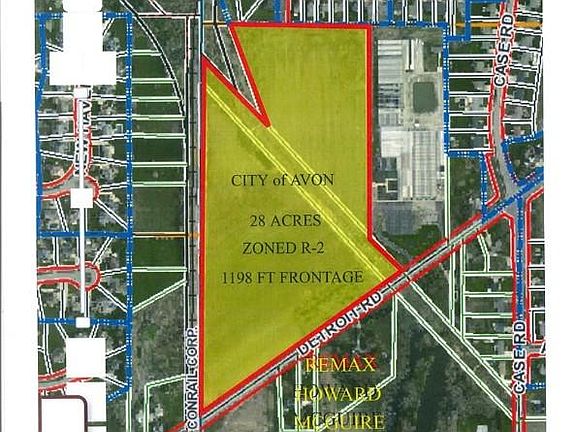 Avon, West side, vacant land. R-2, 2-Family zoning. Farm land. Has few pine trees along Detroit Rd. and rear west property line. Ideal for developers to develop lots for single-family lots or 2-family homes. Utilities are available.