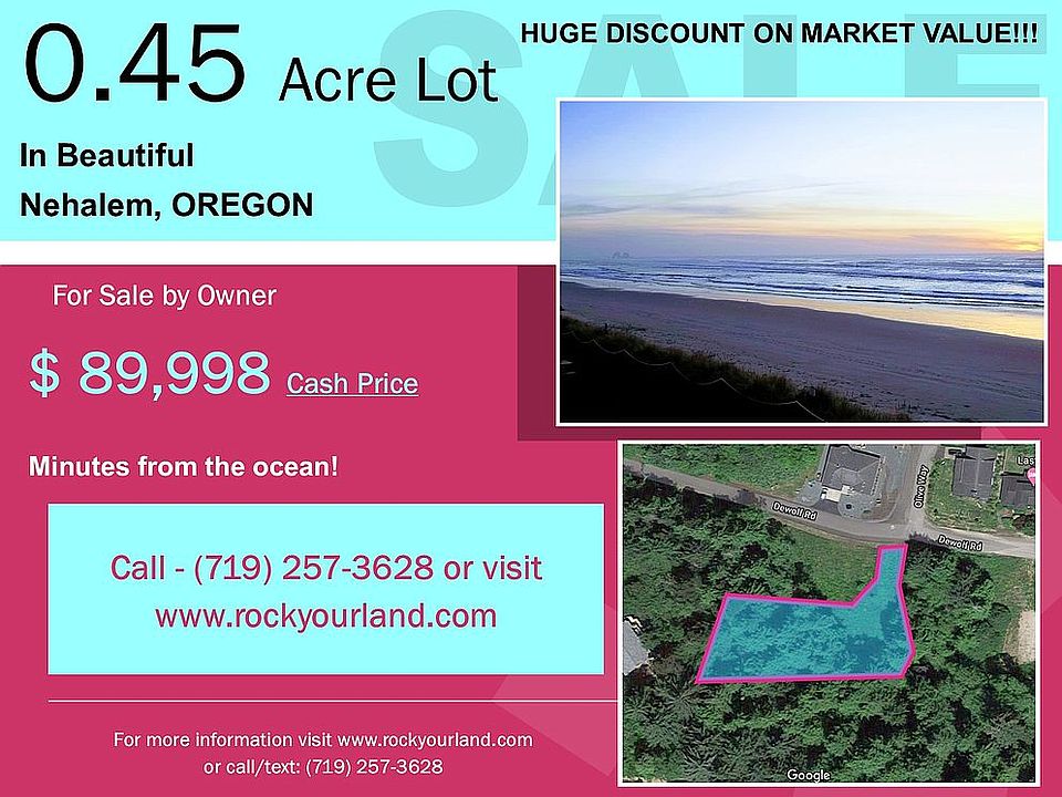 PRICE DROP! “A Charming Coastal Location with Ocean Views” Nearly a half of an acre within walking distance to the beach. This beautiful 0.46 Acre lot is located in Nehalem, Oregon - just minutes from the beach on the Oregon Coast. The property is minutes from local attractions, recreation and dining and less than half a mile from the coast. A property that guarantees a perfect spot for a beach home! The area boasts beautiful homes, rolling hills, trees, mountains, and recreation activities for everyone of all ages. Outdoor activities include hiking, camping, angling, crabbing, horseback riding, off-roading, kayaking, surfing, and more! If the ocean and the outdoors is your passion, the activities are plentiful. If you’ve ever thought of owning property to build your dream home near the ocean, this is your chance to own a beautiful parcel in an area that is perfect for couples, families, and retirees alike! All the comforts of modern living are at your fingertips, surrounded by Oregon coast-line charm, and beautiful scenery to put you in the perfect place to make your dreams a reality. For more information visit www.rockyourland.com or call/text: (719) 257-3628? Own today for $89,998! No Realtors, No Commissions. Property Details: Location: 9290 Dewolf Rd, Nehalem, OR 97131 Zoning: Vacant land Terrain: beach, near mountains and ocean Road Access: yes Market Value: $120,000 DON’T WAIT! This property will go fast! Visit www.rockyourland.com or call/text: (719) 257-3628?