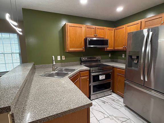 No carpet. Modern Kitchen with new stainless steel appliances n tile floor open to family room allows you to chat with your guests Or watch your favorite show while cooking or loading the dishes washer. It's ready to impress your guests