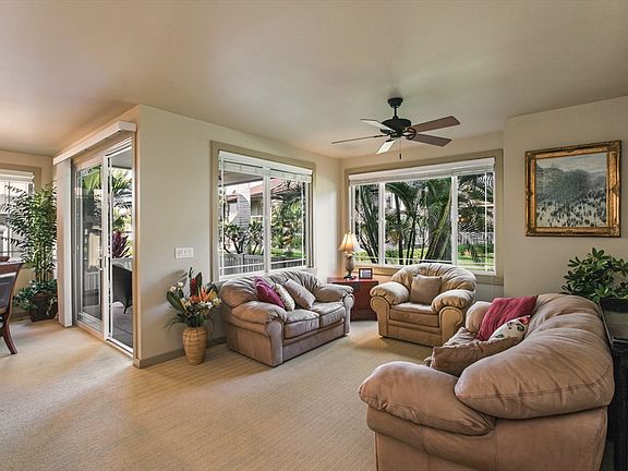 This bright and elegant condo feels more like a single family residence with an open floor plan and high ceilings. The ground floor Alii Park Place unit is surrounded by palms and tropical flowers and it offers a covered lanai and a small fenced yard that is quite private. A one-car garage with an automatic door opener and a deeded parking space provide convenient parking and room to store your golf clubs and dive gear. Alii Park Place is a quiet community of full and part-time residents that does not permit vacation rentals. Get to know your new neighbors over a quiet dinner on the lanai or indoors. This residence offers abundant entertainment space. The kitchen is absolutely beautiful with striking hardwood cabinets, granite slab countertops and stainless steel appliances. A breakfast bar is convenient for simple meals and it becomes the gathering place during a get together. Large windows and glass doors invite Kona's sunshine, a constant reminder that yes, you live in Hawaii. A mark of quality is found throughout the home. The master suite is roomy and comfortable and it opens to a private, outdoor space. The luxurious master bathroom is as practical as it is gorgeous. Two separate vanities with vessel sinks are set just outside the bathroom hotel style. The walk-in shower is finished in travertine with a glass door. Don't hesitate to invite mainland visitors. The guest bedroom offers abundant space and the guest bathroom is beautifully appointed like the master. Alii Park Place is recognized by its royal palm trees that tower over a vast green space. Another highlight is its spectacular lagoon style pool. The space is impeccably maintained and also includes a hot tub and an open air library for those lazy afternoons. The community is just a few minutes away from downtown Kailua-Kona and well-known beaches. Video Tour available. One small dog allowed with board approval.