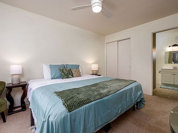 The spacious bedroom offers a peaceful retreat, with a comfortable bed and ample storage space. The bathroom features modern fixtures and finishes, adding to the overall feel of the condo.