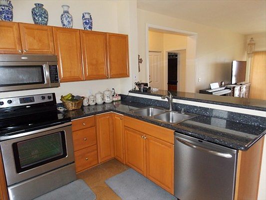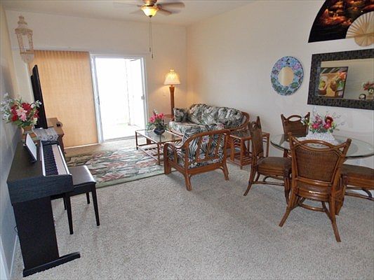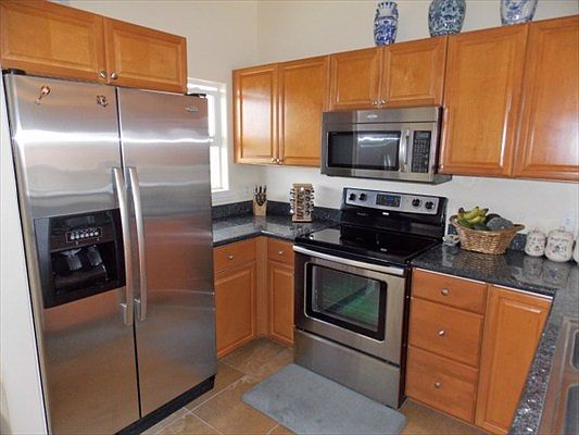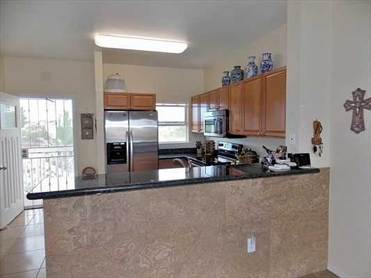 Minutes from town and beautiful beaches, just south of Kona Palisades and Kona Airport; this amazing condo is situated in a lovely garden setting. Due to the unique location of the building with front facing northeast and the rear facing southwest, E201 catches the morning sun with tropical cross breezes flowing gently through the extra windows of this end unit. No need to have an air-conditioning! This end-unit condo is unique compared to other units as it has been blessed with spectacular views of both the ocean and the gorgeous South Pacific sunset from the lanai and master bedroom and the majestic mountain view from both bedrooms, and the front yard. The condo has been immaculately kept by its original owners. Perfect for a primary residence; second home or rental investment, you will enjoy the open spaces around the complex and the 500' elevation. This unit has very top level of color, style and décor. The custom premium Bali blinds compliments the unit. Home features and upgrades: Large 2 bedroom 2 bath single story units have 1010 s.f. of living area, 9’ ceiling heights throughout, steel-framed fully insulated walls and ceilings for energy efficiency and noise reduction, rear lanai with sliding door access spacious living, kitchen area. Solar water heater, granite counter tops and travertine tile flooring in kitchen and baths, add an easy elegance to complement the stainless steel appliances, a high efficiency front load washer/dryer, new light fixtures and ceiling fans. Entertain your guest at the community pavilion which offers ample space to dine, an outdoor cooking area and BBQ grills. 1 Pet per condo allowed. Dogs allowed up to 25lbs and up to 20" in height. Seascape has one of the lowest maintenance fees for a 2 bedroom unit in Kona of $292.00. Come and make this charming and lovely paradise your home! A MUST SEE!