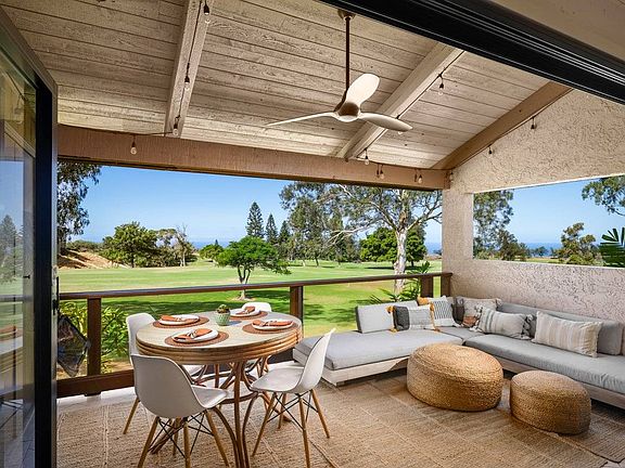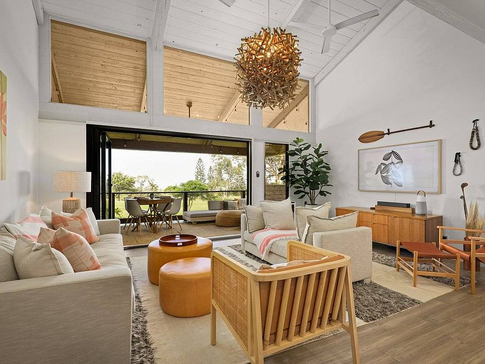Step into this fully remodeled top floor/loft villa for a casual mid-century feel. E201 has been carefully curated and designed by a professional interior designer and it shows! The E building is one of the premier buildings in Waikoloa Villas as it is on the golf course, has ocean views from the lanai, and is well positioned for wind. Easily enjoy indoor/outdoor living as an entire wall of windows folds away to create one large living space. The villa boasts vaulted ceilings and clerestory windows which allow for an abundance of natural light. The loft space accommodates the primary suite which includes a walk-in closet, a renovated bathroom with soaking tub and walk-in shower, and extra storage space on the landing. The main living area includes a guest bedroom large enough for two queen beds, a guest bathroom with stacking washer/dryer, a lovely updated kitchen with newer appliances, and a living room worthy of a magazine cover. Both the living room and primary bedroom are equipped with portable A/C units. The unit is being offered turnkey and benefits from the photovoltaic system offered at Waikoloa Villas for discounted electricity costs.