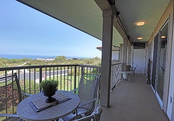 RARELY AVAILABLE.....enjoy this fabulous 180' ocean view from this spacious 3 BEDROOM 2 BATH BRIDGE UNIT condo in Hualalai Village...walking distance to town. This unit boasts one of the largest floor plans in the project with 1,170 square feet of living space. The generous sized lanai off of the living area and master offers magnificent coastline and sunset views. One of the best constructed Condo Projects in Kona. Construction materials consist of: metal framing, stucco exterior with tile roofs, concrete, aluminum anodized railings, copper gutters, downspouts, insulated (R19) interior and exterior wall ~No Pets allowed~ Special features include: * Bridge unit - NO STAIRS, ADA Accessible!!! * Air Conditioning * Vaulted ceilings throughout * 8' SOLID wood entry door * Custom window shutters * Lanai Sunscreen Shades * Generous oversized Master walk-in closet * Stylish slate tile in Kitchen, Living room, hallway * Full sized washer and dryer * Extra closets inside and two secure storage closets on the lanais * Huge kitchen with maple cabinets galore * Stainless appliances * Granite counter tops in kitchen and all bathrooms * Two assigned parking stalls...one covered * Secure storage unit in covered parking area * Steel Frame Construction * On-site Manager * 2 Parking Stalls ( 1 covered with storage attached, & 1 open ) The information herein may contain inaccuracies and is provided without warranty or guaranty of any kind. Agents and Buyers must independently verify any info they deem material or important to their purchase or any offered price thereunder.