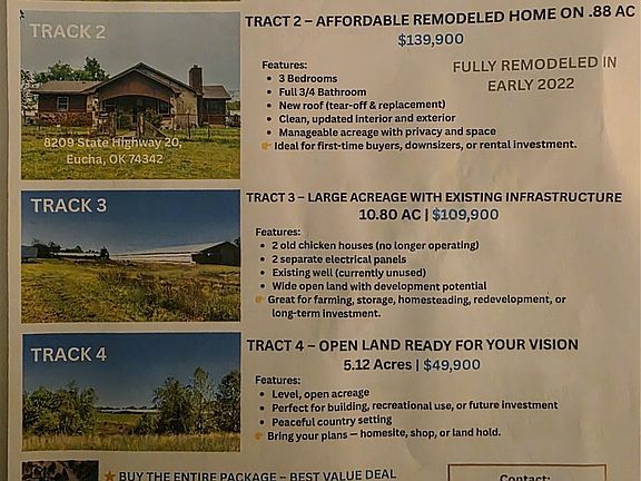 Located in Delaware County, east of the community of Eucha, you will find this 5.12 +/- acre property along East 420 Road. The seclusion of this small acreage tract is ideal for a future homesite or utilize the property strictly as an investment opportunity or recreation getaway. The acreage is frontage by State Highway 20. Come check it out and make it yours today! Additional lots are available for purchase and/or urchase all 4 tracts for $399,900.00