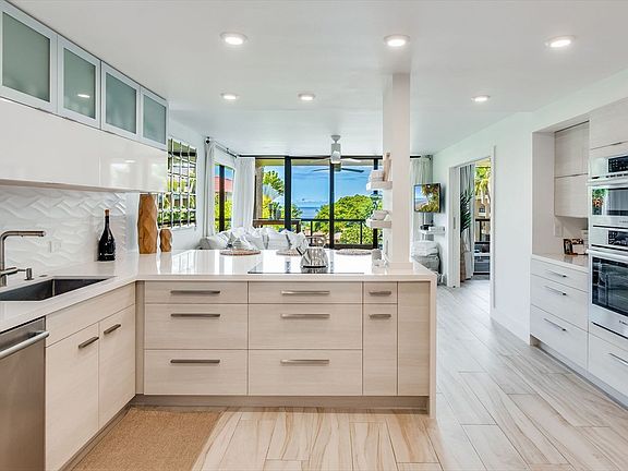 This 1 bed 2 bath unit is the epitome of design, function, and quality at Kona Pacific. From the moment you walk into the front door you will notice the dramatically revised layout, enjoying peaks of the ocean before you even take off your shoes. The hard to find corner unit allows for additional natural light to flow into the unit, increased ocean views, and extra space on the wrap around lanai to enjoy the sunsets and listen to the waves crash close by. In addition to relocating walls to provide for a better all-around layout, new sheetrock, tile flooring, interior doors, plumbing, electrical, countertops, cabinets, and appliances were also installed: this condo is basically brand new! The close to town unit features finishes such as Kohler plumbing fixtures, Emtek door hardware, dimensional shower tiles, and frosted glass doors which allow light to pass through while maintaining privacy; all of which can be found in numerous resort level homes on the island. Pull up a barstool to the large kitchen peninsula with a beautiful quartz countertop with a mitered waterfall edge. The beautiful mixture of wood and high-gloss white cabinets provide a clean, modern, and warm feel to the space. Details such as rollout pantry shelves, expansive full-depth drawers, and additional cabinets on the back of the peninsula were not overlooked. Sit on your covered lanai and watch the sunset disappear into the horizon during several months out of the year. Finished off with practical amenities such as Lutron dimmable switches throughout and dual shower heads in the master bathroom, this is the stunning and close to town unit you have been searching for.