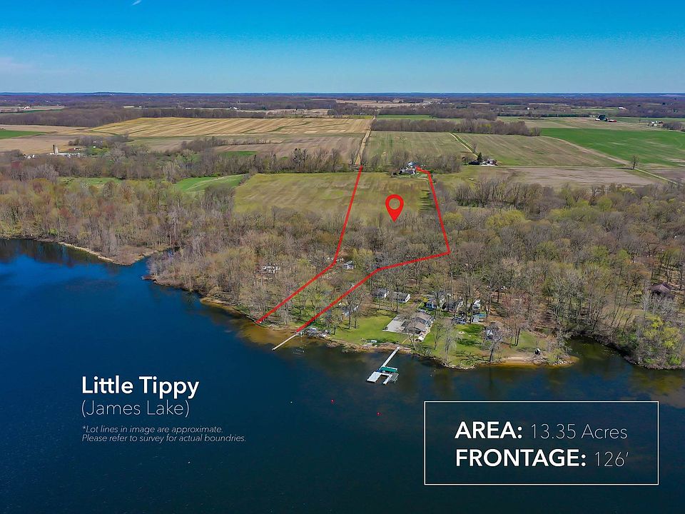 *13.35 acres of farm ground and woods. *126' of beautiful lake frontage. * Includes farmhouse and cottage. Here's a rare opportunity to own virgin lake acreage on one of Indiana's most popular full-sport lake chains. Family-owned for over 100 years, this beautiful parcel is one of 9 new lots recently created on the north side of James Lake (Little Tippy.