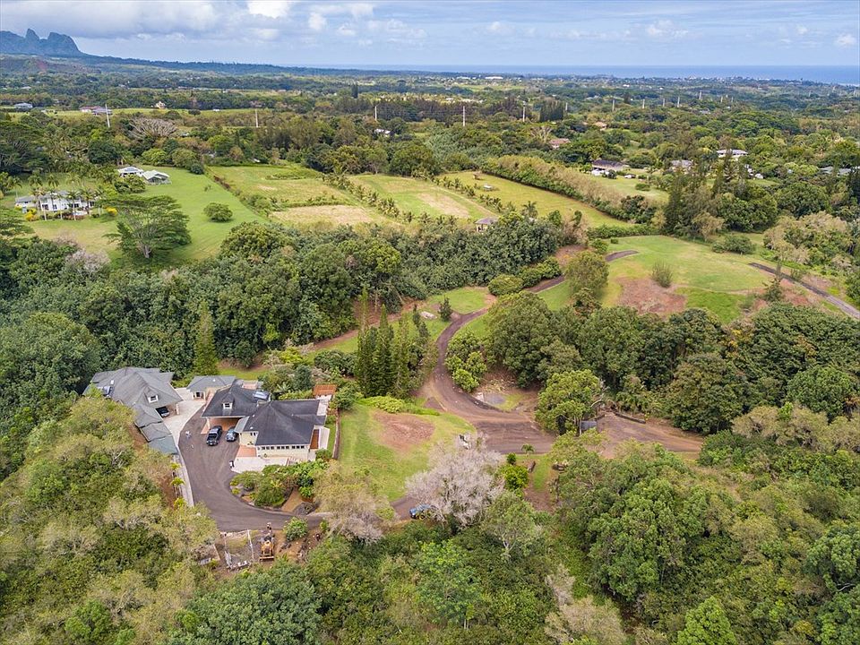 Secluded, substantial, and solid family compound on 6 acres. This Hilltop Hideaway has had everything upgraded, refurbished, tightened up, painted, and polished for the new owners. Built with concrete and love, this home was built to provide a variety of flexible uses for you. Massive one bedroom main house with several pods for extended separate living with most of home designed for single-story living. Numerous options for bedrooms, Man Caves, She Sheds, home office, yoga studio, hobby centers, and more. Over 6500 square feet under roof. Property also qualifies for an additional Guesthouse and a site has been prepped. Drive up into the mountains behind Kapaa Town, near to the end of civilization, and as the road narrows you will disappear down a long concrete driveway thru valleys and over hills to enter your private compound. Then thru your gated entrance over a year round scenic stream and up to your Hilltop Hideaway overlooking your 6 acre kingdom. Owners have spent the last year+ detailing out this home for the next owners and you will appreciate the thoughtfulness of design, quality of build, and level of finish. Hurricane shelter has massive storage, small bathroom, generator to power entire house and even has pet shelter as well. Storm coverings for all windows on the property. 6.5 inches of concrete ceiling. 300 gallon food grade water storage system. You will be just fine. Numerous pictures and Kauai Media House video tour available, but you will want to contact your Agent for an appointment to experience this property.
