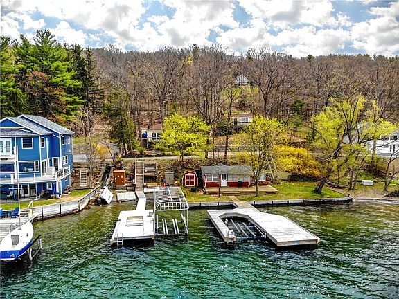 This Keuka Lake East side retreat sits tucked back into the trees overlooking the lake just minutes North of Hammondsport. The spacious lot maximizes the outdoor living areas with multiple decks, stone patio, large permanent dock, and parking galore! Choose between lower road parking for easy access or the large parking area off Route 54 for overflow. The separate guest / bunk house is great for company, family get togethers, or a place for the kids to hide out. Imagine the possibilities! Be sure to check out the 3D virtual tour link as well.