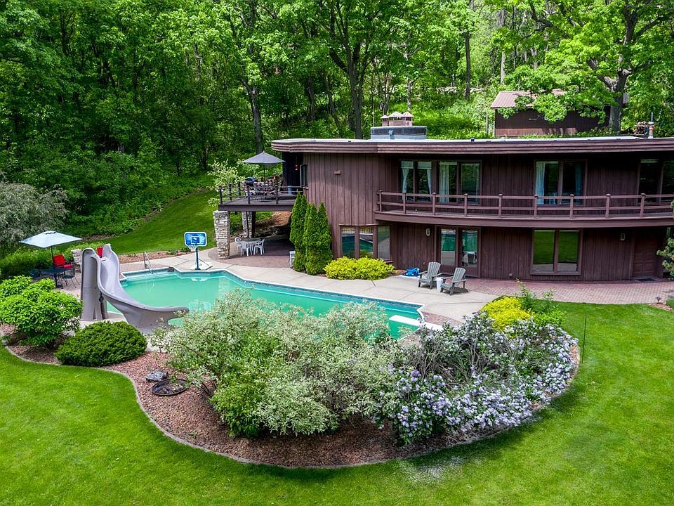 Show 6/5. The Vollendorf ?Baysweep?, a striking architectural marvel spanning more than 180 degrees & featuring 3 cylindrical wood & Lannon Stone towers. Situated peacefully on a 1.69-acre lot, surrounded by mature trees & landscaping, this home offers the perfect setting for a private resort or an entertainer?s dream home. Step out onto the wrap-around deck after dinner to overlook a 20x50 ft. in-ground heated pool & landscaped patio. Inside, the home continues to impress with 2 large fireplaces providing warmth & charm. The custom curved kitchen cabinets add a touch of elegance and unique style to the heart of the home. LL walkout is perfect for entertaining, featuring a spacious family room w/fireplace and a well-equipped bar. 10 miles from Lake Delton, Devil?s Lake & Lake Wisconsin.