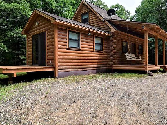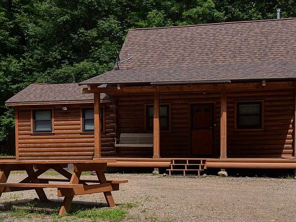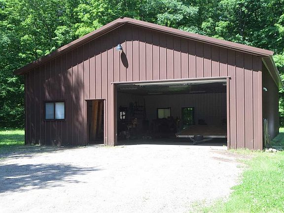 40 Acres of mostly hardwood hunting/recreational land adjacent to 160 acres of State-owned land. Year around home full log home with full poured walls lower level. 2 nice size decks, one covered. Outside wood boiler connected to pole building for in floor heat & also to log home forced air heating. Secluded location, as home cannot be seen from road. Pole building w electric, concrete, large garage door, heated by outside boiler or hot water tank in building. Land is completely wooded, except for yard around house and pole building. Small stream on State land property next door.