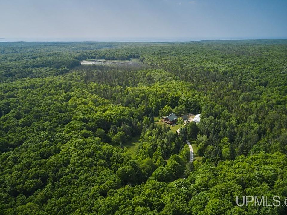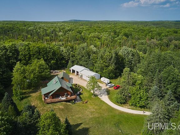 KOSKI LOG HOME handcrafted in Michigan’s Upper Peninsula using Red and White Pine situated on 20 very private ACRES bordering State land on 3 sides. The main level features kitchen with Quartz countertops & Cherry cabinets and stove in the island, dining area with gas fireplace and living room. Plenty of windows and natural light. There’s a beautiful masonry radiant heat fireplace with a warming oven placed nicely in the center of the living space which warms the house so nicely! ½ bath too. Main bedroom with full bathroom with tiled shower. You will want to relax in the 12x20 3 season room with many windows. Upper level has a bedroom with a bath and a large loft sitting area. The ground level of the home has so much to offer also with the large family room area with a fireplace, 2nd kitchen great for baking and canning, area for the 3rd bedroom, storage room or craft room, walk in closet and utility/laundry room. The lower level would also work great for separate living quarters if desired. Home is very energy efficient and Interior walls are insulated. Anderson windows throughout except the sunroom. Railings and trim are all handmade. Home is situated to receive the afternoon sun. Deck is 12’ wide and wraps around the house. For convenience there is a lift system from the ground floor to the main level deck for lifting groceries or wood. Outside you will find a nicely landscaped yard, Apple trees, blackberries, pond 8-9’ deep and plenty of wildlife! You’ll have plenty of garage space with the 2.5 car garage with water connected and an upper level for storage or a sitting room. Two-30x40 garages one with a workshop insulated from floor to ceiling and heated with wood stove and a lean-to. Elevated deer blind even the pickiest of hunters would be comfortable in. Plant your veggies in the greenhouse that has electricity and water. Trails throughout property great for walking and snowshoeing. High speed internet and a county maintained road.