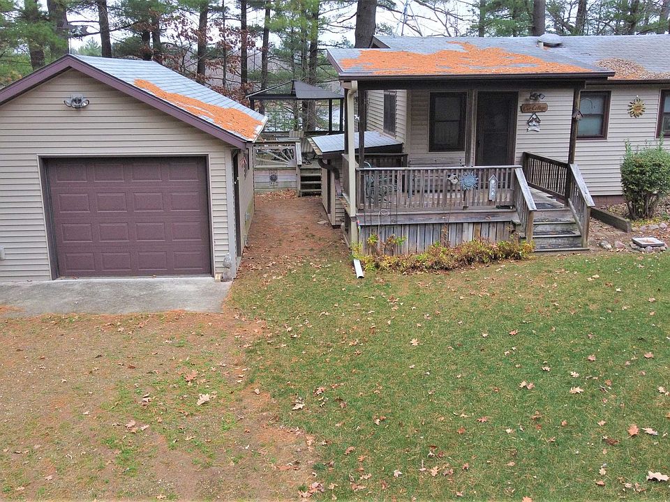 Waterfront cottage/home on Moon Lake North of Iola . Updated and in good condition. Nice front porch and deck with view of the lake. Stone fireplace with large windows looking to the lake. Stairs to the water and the pier all in good condition. Detached garage or workshop. Newer driven well, conventional septic. Being used as three seasons property now but fireplace heats and home has a small electric wall heater. Crawl space under main house and posts under living room. Several storage buildings.