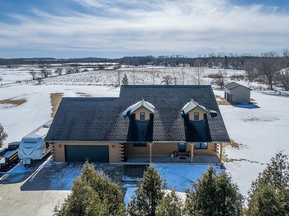Gorgeous custom built log home on 5.5 rolling acres, partially wooded with a stream. Beautiful country setting with your own covered front porch! Custom hickory cabinets accent the hickory floors. Home offers first floor laundry, pantry, main bath with double sinks, huge 16x6 walk-in Master closet. Updated central air. Attached 2 stall garage is insulated and finished off. Two story outbuilding, (18x24), with overhead door, concrete floor and finished/insulated main level. High quality shingles, (see attached info). Rough-in for bath in basement. Whole house water filter. LP, Mound system, well and electric water heater. Acreage and SF per assessor. Small shed is older and was moved to property. NOTE: Patio door is secured as there is no deck. No railing on loft.