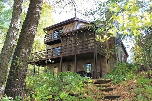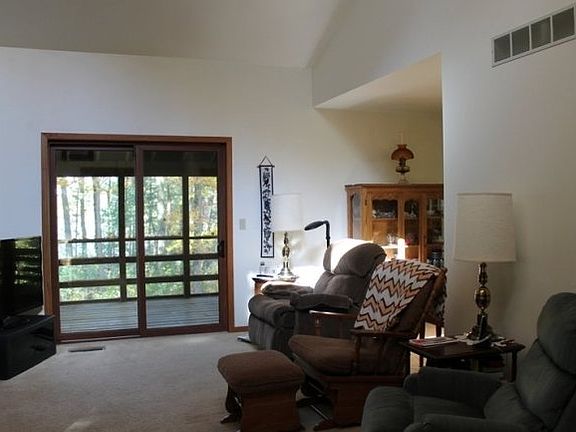 Enjoy beautiful sunsets over Rollofson Lake in this two story home. The wooded lot has 108' of frontage on this clear, spring fed lake, includes garden shed and pier. The home has low maintenance siding, an unfinished, walk-out basement for you to add your own touch. First floor 16 x 24 master bedroom has a large walk-in closed and full bath. Open concept kitchen/dining/livingroom with fireplace, lofted ceiling, and screen porch for year around enjoyment. Wood floors throughout the entire first floor were installed in 2019. Lovely front foyer and covered front porch entry. Second floor has another master bedroom with attached bath, along with two additional bedrooms which share one more bath. Heat and airconditioning are energy efficient from this heat pump system purchased in 2020. Appliances are included. This home is entirely handicapped accessible.