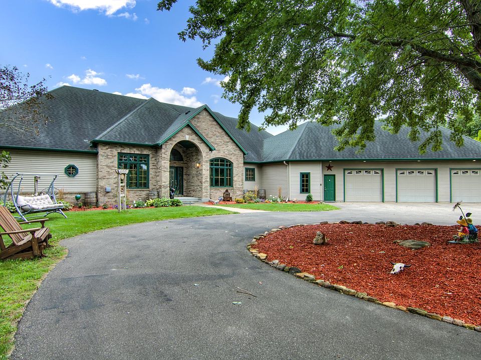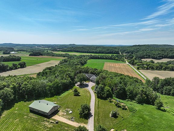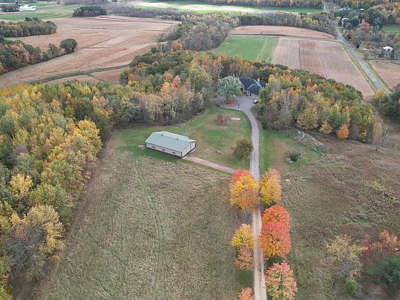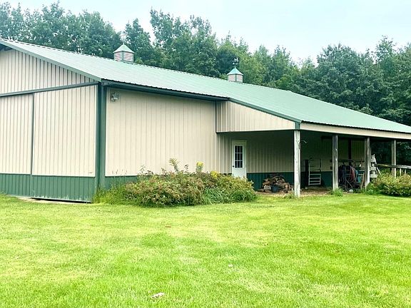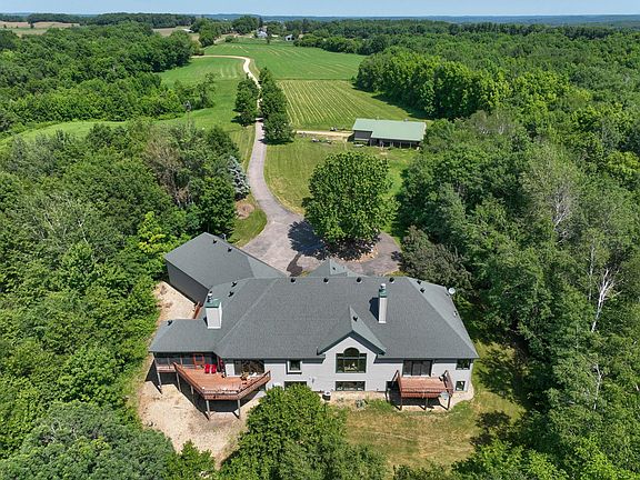 BEAUTIFUL CUSTOM (4+) Bedroom & (4) Bathroom country home situated on a private 20 acre parcel! So many incredible features inc amazing kitchen w/ custom hickory cabinetry w/new cooktop & frig, grand great room w/dramatic vaulted ceilings w/custom Marvin windows & quality walnut shelving, spacious primary suite w/private deck & beautiful cherry cabinetry in bath, (3) fireplaces, main flr laundry, 6 panel doors, nice screened porch, hot tub rm w/in flr heat, & nice walkout basement w/ in flr heat adding a wonderful family rm, 2nd stairway leading to garage, large bar/2nd kitchenette for entertaining, (2) more bedrooms, 3/4 bath, huge workshop & loads of storage!! Property also inc 36' x 64' pole bldg w/electric & water w/fenced pasture for the animals! Quality throughout! Fiber optic internet available. Great updates inc: new gutters, (2) furnaces 2021, (2) AC units 2024, new carpeting in the great room, formal dining/sitting area, & office! Nice landscaping! Country living at its best!