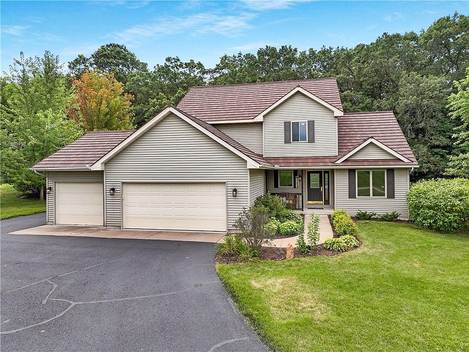 Want to get out of the city limits and spread your wings? Check out this beautiful 2 story home in Interlachen. Private 1.55 acre lot with mature trees and plenty of wildlife. This home features 5 bedrooms plus an office, 3.5 baths & 3 car garage. Beautiful concrete patio off dining, blueberry, raspberry bushes, rhubarb and lots of perennials adorn the huge yard. Updates include: 2022- new upper level carpet, sealed driveway. 2021- new steel shingled roof, refrigerator, sealed patio. 2020-new ac unit. Also in past 10 years-some windows replaced, remodeled main floor master bedroom/bath with walk in tiled shower, new hickory floors on main level. LL features large family room plus wet bar area (need ceiling above bar). Eau Claire schools, just a few miles to southside restaurants, shopping. Data from 3rd party sources, buyer should verify.
