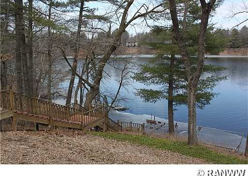 Lakefront retreat! Relax on the waters edge of Tainter Lake! This home is on 87 feet of frontage. Open design - wall of windows overlooking the lake. Beautiful hardwood floors thru-out the main level. Wood burning fireplace on main level & gas fireplace in lower level family room. Full basement w/family room with built-in bar area & 2nd bath, work room & storage area. Included w/home is roll in dock & boat lift. New roof in 2013. GREAT VIEWS!