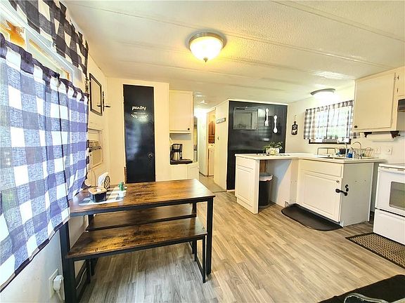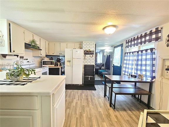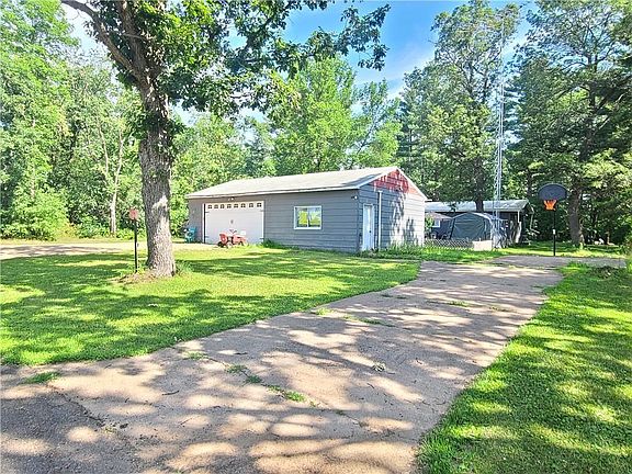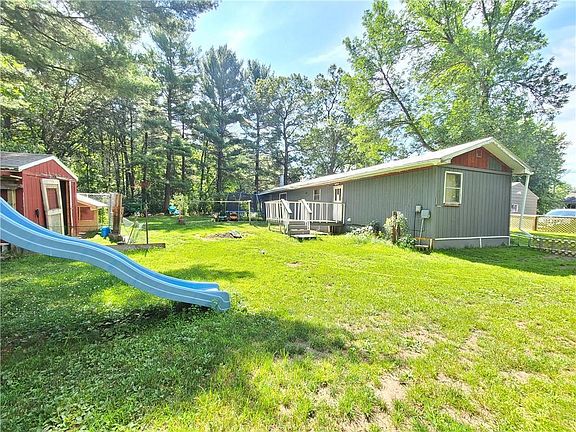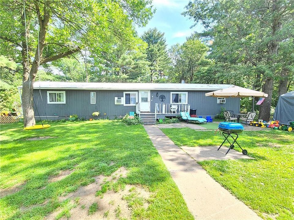 Here is your opportunity for an affordable property right across the street from Tainter Lake w/ water view! This 2-bed, 1-1/2 bath manufactured home sits on a large 1-acre lot with a trail leading to an open area that would be a great place to sit around the campfire. Large 2 car garage has extra space for an office, tool shop or both! Lots of room for parking with the double driveway. Home has many recent updates, including new flooring, osmosis system, new furnace 2021 and water heater 2020.
