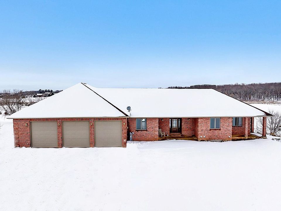 Spacious updated all brick ranch home situated on 19.48 country acres. Tillable land w/wooded backdrop. Great for horses, livestock or hunting. Nearby access to snowmobile trails. Oversized 40x50 heated garage boasts basement access, water, attic storage, 12' ceiling & 3 -10x10 overheads. Home is freshly painted & offers new luxury vinyl flooring throughout. Kitchen features new cabinets, SS appliances, walk-in pantry & dining area w/transom floor to ceiling windows overlooking the acreage. Separate formal dining room could be used as office or bedroom. 3-bedroom suites w/their own bathrooms on 1st floor. Walk-out lower-level offers a large family room w/pellet stove, bonus room w/sliding glass doors to backyard & half bath already plumbed & framed for future shower. Septic is at-grade