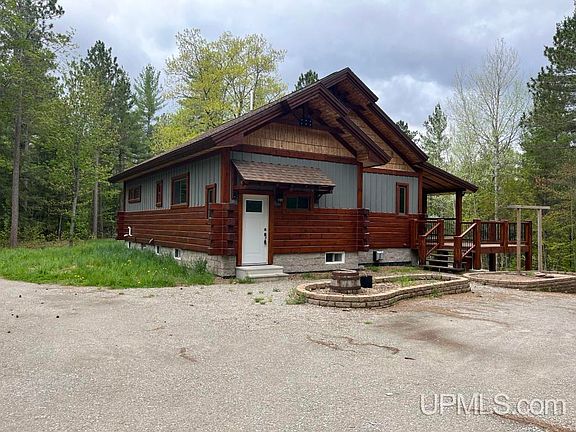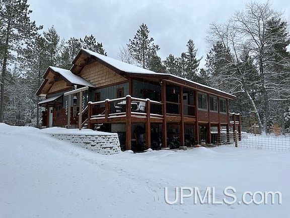 WELL CONSTRUCTED home built in 2016. 4BR, 3BA, this place is ideal for a single family, 2 families or as a vacation rental which it is zoned for. Many options here! The structure is log sided and well insulated with spray foam. Main floor has open kitchen & living area, 2BR 2 BA and a large sunroom/hobby room which leads to a covered porch and a deck off the back. Kitchen has cabinets made by Cretens, copper sink, stove in an island, walnut countertops and lots of storage. Living room has electric fireplace, but the whole house is heated with high efficiency propane boiler. Fiber internet is connected. Lower level which has egress windows, recently finished with 2 additional bedrooms, 3rd bathroom, utility room/laundry and large open family room. Main floor BR closet is plumbed for washer & dryer if you would like to move it from the lower level. Electric panel is ready for a Generator. Appliances 2021. Fenced area for pets. All corners are marked. This property is a wide 2 acre parcel which allows for great privacy and is located on a year round paved road! Enjoy all the U.P. has to offer in every season right from your doorstep!