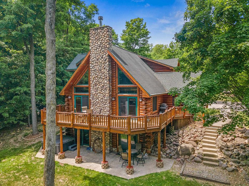 Incredible Find! Meticulous log home nestled into 6.4 (p/assr) wooded acres with an awesome outbuilding where the possibilities are endless. High end craftsmanship is evident throughout this captivating home! A floor-to-ceiling stone FP in the enormous great room is flanked by massive windows and patio doors that flow out to the elevated wrap around deck offering spectacular wildlife filled views from any direction. The huge kitchen will satisfy any chef w/walkin pantry and plenty of counterspace. Retreat to the owner's oasis of solitude with amazing detail and reading loft. The walkout LL w/in-floor heat boasts a fam room, BR, full bath, wet bar and access to garage. Half of the huge out-building is finished w/in-floor heat for the hobbyist and includes a 12 ft lean-to. Welcome home!