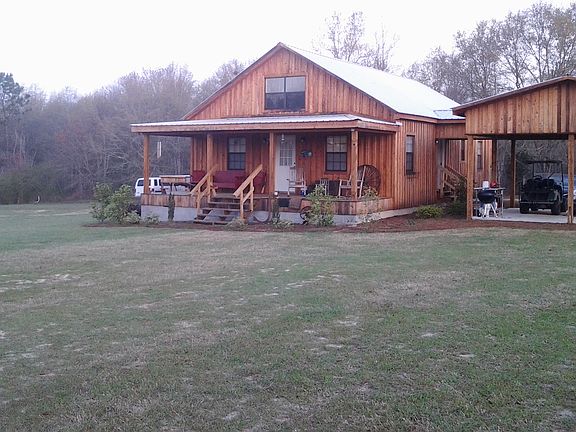 Cypress interior and exterior walls with pine floors. 20 ft. ceilings in living room. Loft bedroom. Huge front porch. 20x24 wired shop, metal shelter, storage building, and chicken pen to match the house! 1/8 acres catfish pond. Fenced and gated. Mature pecan trees as well as fruit trees.