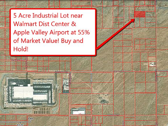 This is an expansive 5 acre Industrial zoned lot on the outskirts of Apple Valley. You have no time limit to build, The zoning is Industrial. This property is 2.1 miles from the Public Safety training center and Walmart Distribution Center. A new Distribution center for Big Lots is under construction and is slated to open in 2020 which should increase the value of this entire area as more jobs and businesses move in.