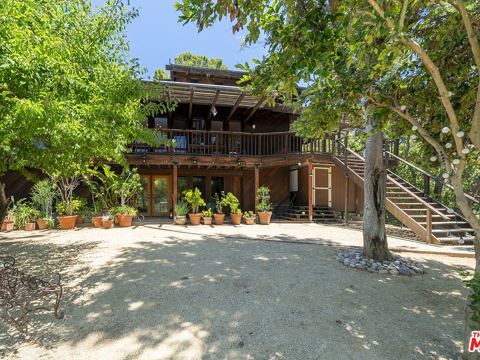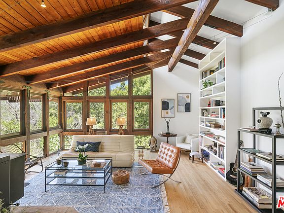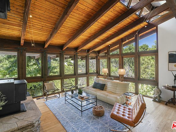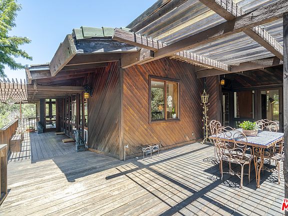 Remarkable Stunning wood & glass home with striking cross canyon of Topanga state park and the famous Powder-horse ranch. This brilliantly crafted home has generous wood beam each accentuated with Iron that surround wall to ceiling glass windows, highlighting the spacious living room. High ceilings throughout lend incredible space to the entire home. This is a master piece to hang masterpieces. Home was created to take advantage of the beauty of the canyon, with a pelt iron fireplace, that supplies warmth and romance. hand crafted doors open out to large decks were you can take advantage of the afternoon sun & cool evening breezes. Extensive master bedroom suite has a pvt entrance and deck. The artistic 2nd bedroom opens up to large covered tranquil deck, while the large third bedroom could be a perfect workout space. Separate Guest quarters and tons of Land to relax or hike on, large storage sheds add extra space, Location is just seconds from Topanga State park.