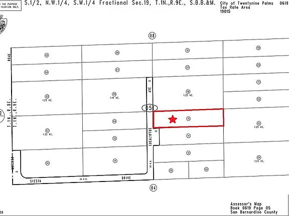 Large vacant lot away from crowds, but only a few blocks from a thriving housing community. Lot is accessed by the only legal road which ends on neighboring lot, meaning fewer neighbors building in the future. Epic views of the Morongo Basin to the north. Clear view of Sunrise and Sunset as well as the Joshua Tree National Park mountains to the south and even the Big Bear Mountains to the west. Power is available on Morongo Rd. For water you would need to drill a well. Take Siesta Dr. East off Morongo Rd and follow the road to the Left. Lot is there on the right, on Eucalyptus Ave. Buyer to do Due Diligence. Contact Seller Rebecca P. Parcel Number: 0619-051-15-0000. Legal Description: N 1/2 N 1/2 SW 1/4 SE 1/4 NW 1/4 SW 1/4 SEC 19 TP 1N R 9E .625 AC