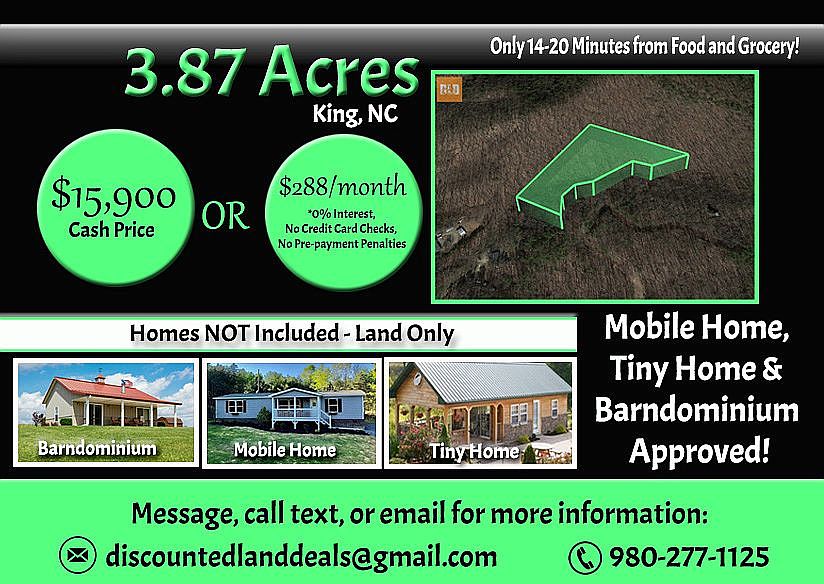 3.87 acres in King, NC ** MOBILE HOME, TINY HOME, BARNDOMINIUM ALLOWED** 10% Off Market Value - FINANCING AVAILABLE! Discounted Cash Price: $15,900 Quiet, wooded, mountain side lot located in King, NC. Take advantage of this blank canvas property and create a mountain get-a-way. Stokes County zoning has zoned this property R-A: Residential Agricultural creating endless possibilities! Has been approved for New Mobile Homes and Modulars as well as the trending Site Built Tiny Homes and Barndominiums. Build your mountain retreat on this quiet secluded lot today! Property Details Address: Evans Rd, King, NC 27021 County: Stokes APN (Assessor’s Parcel Number): 691604605196 GPS Coordinates to locate property: 36.379857, -80.302345 Lot size: 3.87 Acres Approx. Dimensions: 766ft X 228ft X 594ft X 518ft Building Restrictions: Building restrictions to Single Family Homes (New Mobile Home, Modular, Site Built Tiny Home, Barndominium or Stick Built Home) Sewer/Septic: Septic Installation Needed Water: Well Installation Needed Electricity: Service provided by Duke Energy Annual Property Tax: $46.62 Food 20 minutes away Grocery 14 minutes away Pharmacy 18 minutes away Hospital 20 minutes away Madik Playground 18 minute drive Carolina Ziplines Canopy Tour 16 minute drive Historic Bethabara Park 32 minute drive Hanging Rock Park Lake 22 minute drive Mount Airy 38 minute drive Winston-Salem 36 minute drive Martinsville, VA 1 hour 6 minute drive Make this property YOURS for a cash discounted price of $15,900! We are motivated to sell - All cash offers will be considered! Message, call, text or email us today to get started. We make it super easy for you! 980-277-1125 discountedlanddeals@gmail.com Visit our Facebook page at www.facebook.com/discountedlanddeals to view all available properties! **As with any purchase of land, Buyer is responsible for verifying all information with the city/county as to what can and cannot be done with the property and confirm availability of any utilities/services for the property. Seller makes no warranties or representations about the land.