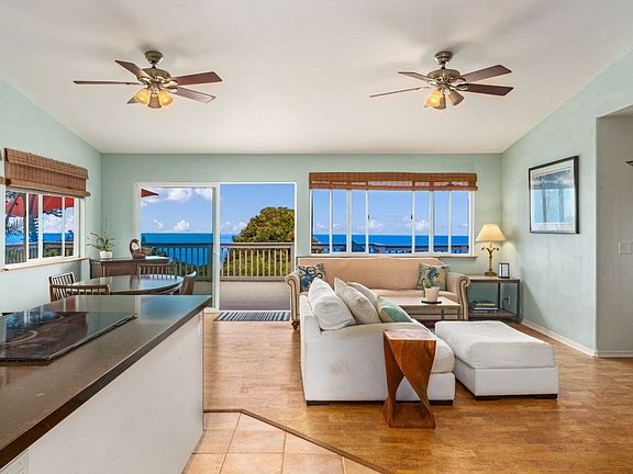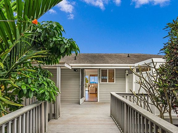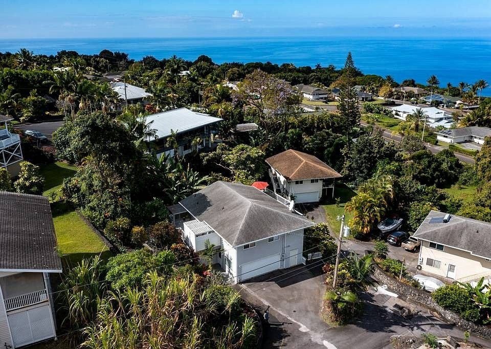 Enjoy expansive big blue ocean views all the way to Kailua-Kona from the huge lanai of this 3 bedroom, 2 bath home in Kealakekua. Walk up stone stairs lined with rock walls and tropical landscaping to the front entry lanai. Step inside to the bright, open floor plan with freshly remodeled kitchen which features rich, dark chocolate Quartz stone countertops and clean white cabinetry. Feet love the natural cork floors throughout. Slider doors open to the ocean view lanai which extends the length of the home. Eat inside or outside under the covered lanai section with ample room for a large table. Cozy up for a sunset or moonset on the ~ 440+ sqft lanai. Upstairs is a large bedroom with extended area for piano, desk, yoga, etc that opens on to the lanai. The second bedroom, currently used as a guest and workout room, share the spa-like bathroom with the main bedroom.The upstairs bathroom was recently remodeled and opens on to the private, additional outside shower room which is perfect for coming home from the beach and washing off the sand. Walk down the stairs to the third bedroom ensuite with living room and kitchen. The downstairs has a separate entrance. This area could be configured in many ways - as an inclusive 3rd bedroom with the house and a separate room for home office or as a completely separate living area; perfect for extended family, a rental or as a hosted AirBnB . The 2-car garage is flanked by large storage areas. These are both currently used as storage, however there is more than enough room to make one a workshop. * The tropical backyard has a nice grass lawn, colorful flora including bananas, bamboo and some raised garden beds. * The home is in a condominiumized subdivision on a 10,000 sqft lot, with a low HOA fee Conveniently located to all the nearby amenities of Kealakekua town which includes; the Kona Community hospital, banks, post office, grocery store, bus stop, The Korner Pocket bar & restaurant.
