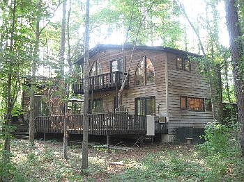 To learn more please email Jeff or call toll free at (866) 642-5910 ext 155715. One-of-a-kind, multilevel passive solar house with multiple decks & balconies. Very private but close to UNC, Southpoint Mall & RTP. Nice home office with 20' wrap-around built in desk. Beautiful hardwood floors, efficient wood stove that allows open fire, new propane furnace & central air. Washer/dryer connections in seperate laundry room. Includes seperate 10' x 10' workshop/studio. 2 or 3 bedrooms. 1 1/2 baths. Large wooded lot that backs up to farm. 1/2 acre dog pen. Available for May move in. Call for full address & appointment. Not visible from road, no drivebys please.