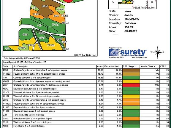 This is a productive, 152-acre, Jones County farm located in a strong area. There are 137.74 crop acres with Chelsea-Fayette-Lamont, Fayette and Colo-Ely soils. CSR2 on the crop acres is 55.00. See soil map for detail. There are approximately 1.74 acres enrolled in a CP-8A contract that pays $321.39/acre - or $559 annually - and expires September 30, 2026.